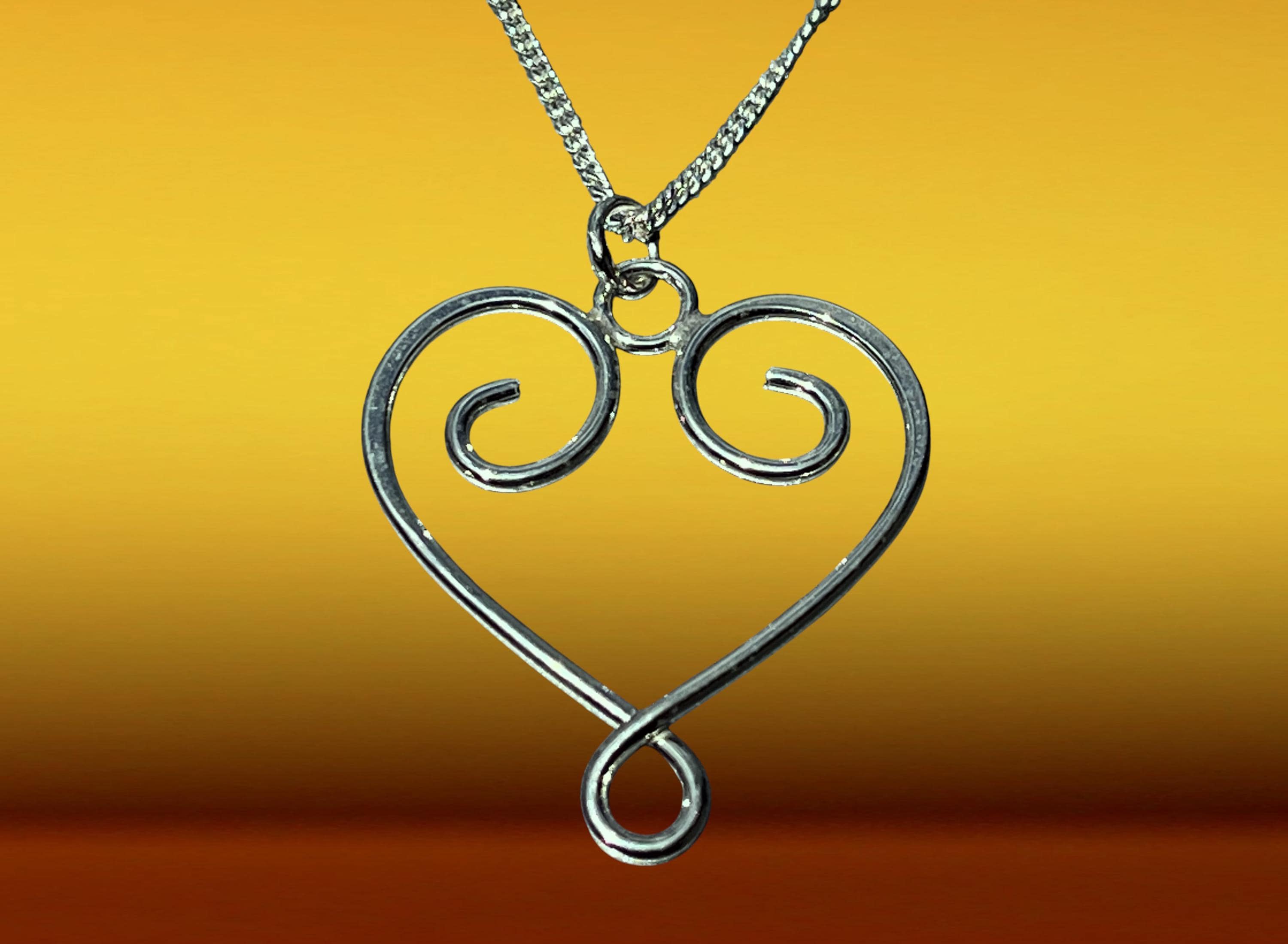 Elevate your accessory collection with our exquisite Scroll Heart Pendant, a stunning piece that beautifully marries artistry and craftsmanship. Crafted from high-quality 1.2mm round wire, this pendant features a unique and intriguing shape that captures the essence of love and elegance. Its delicately planished external curves create mesmerising highlights that dance with light, ensuring each angle is a new delight.