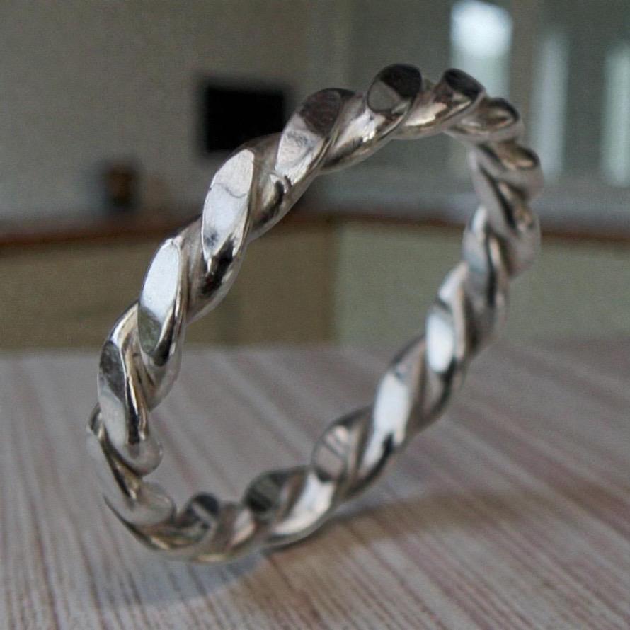 Looking for a unique and beautifully crafted ring? Look no further! This stunning ring is handmade using 1.8mm round section Sterling Silver twisted together and finished to a high quality. The ring is then planished between a stake and hammer, creating a flattened outer surface that adds a touch of elegance.