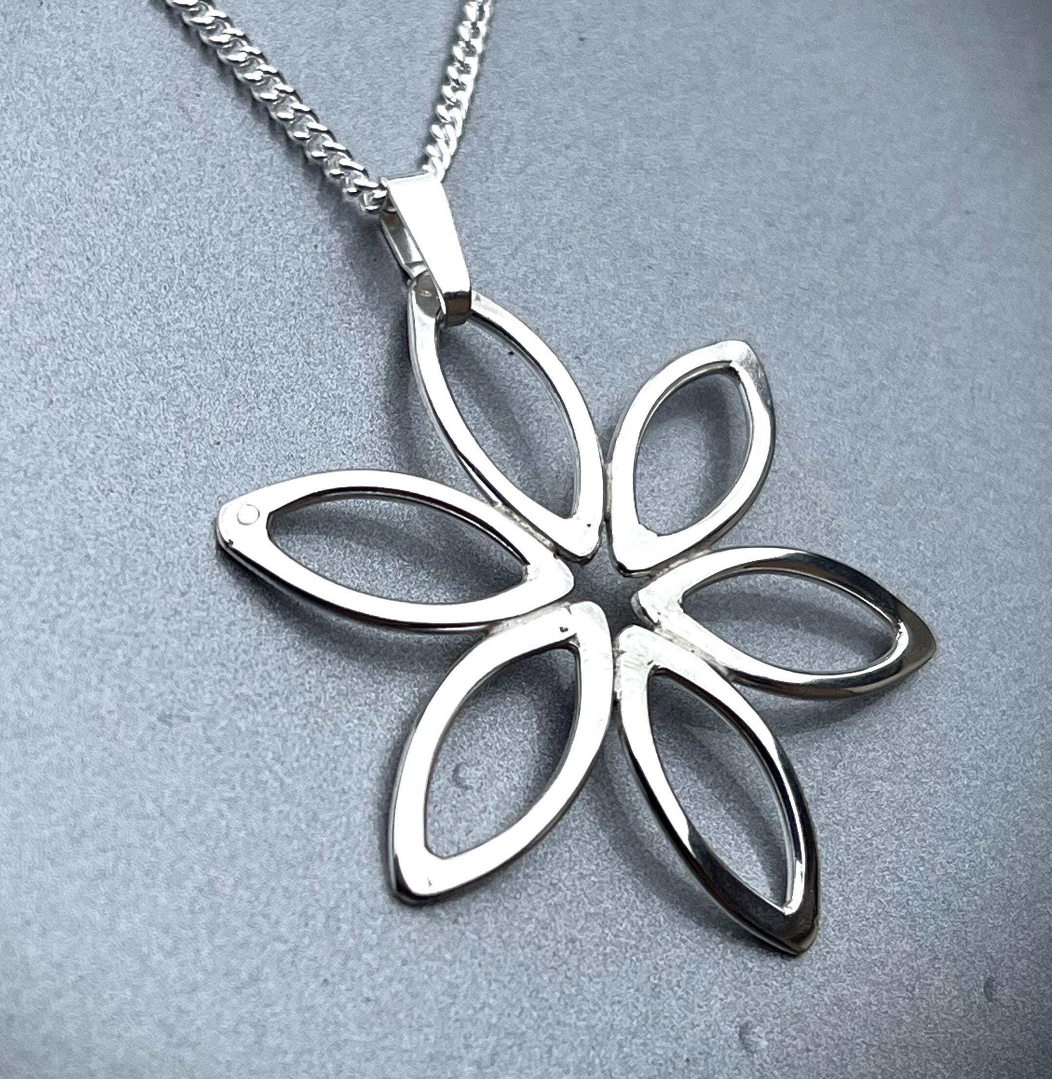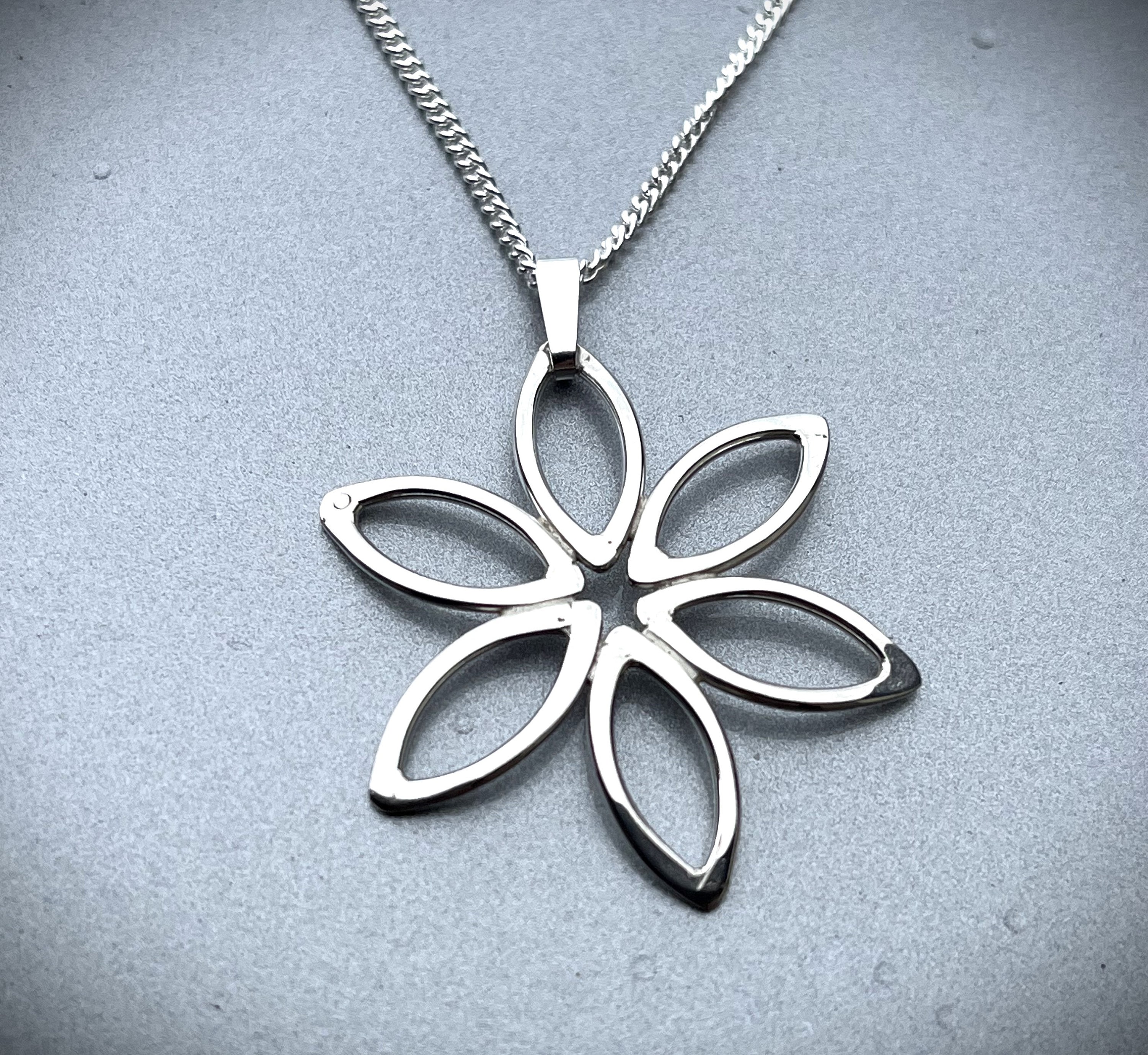 Embrace the elegance of nature with our exquisite Six Petal Flower Pendant. This stunning piece of jewellery is intricately crafted from premium 1.2mm Sterling Silver wire, capturing the delicate beauty of a blooming flower with traditional craftsmanship.