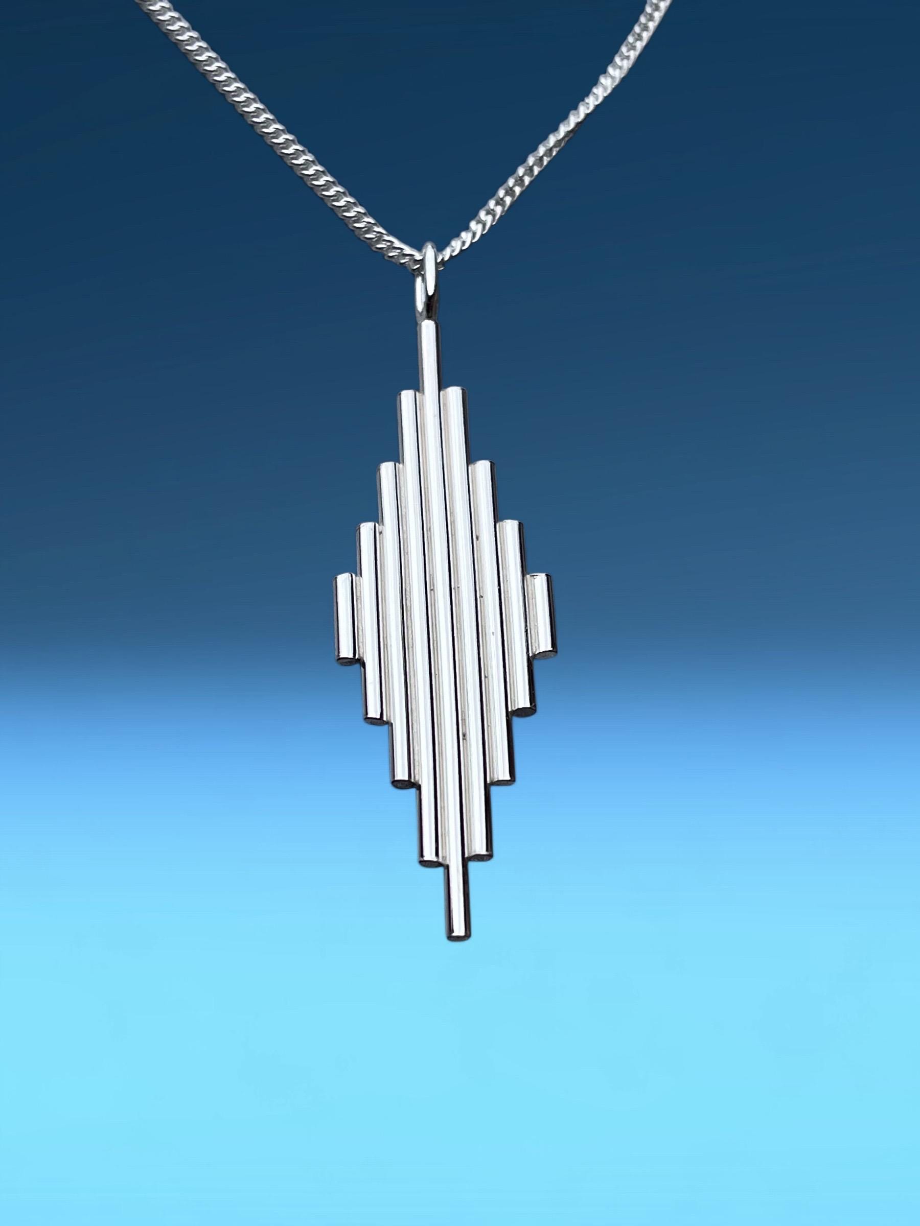 Hand-formed from 1.2mm sterling silver wire, the tapered Deco tower design is complemented by a polished finish, giving it a sleek and lightweight look. It comes ready to wear on an 18-inch sterling silver curb chain with a spring clasp for easy application. The pendant is packaged in a soft-touch gift box, making it ideal for gifting on birthdays, anniversaries, or any special occasion.