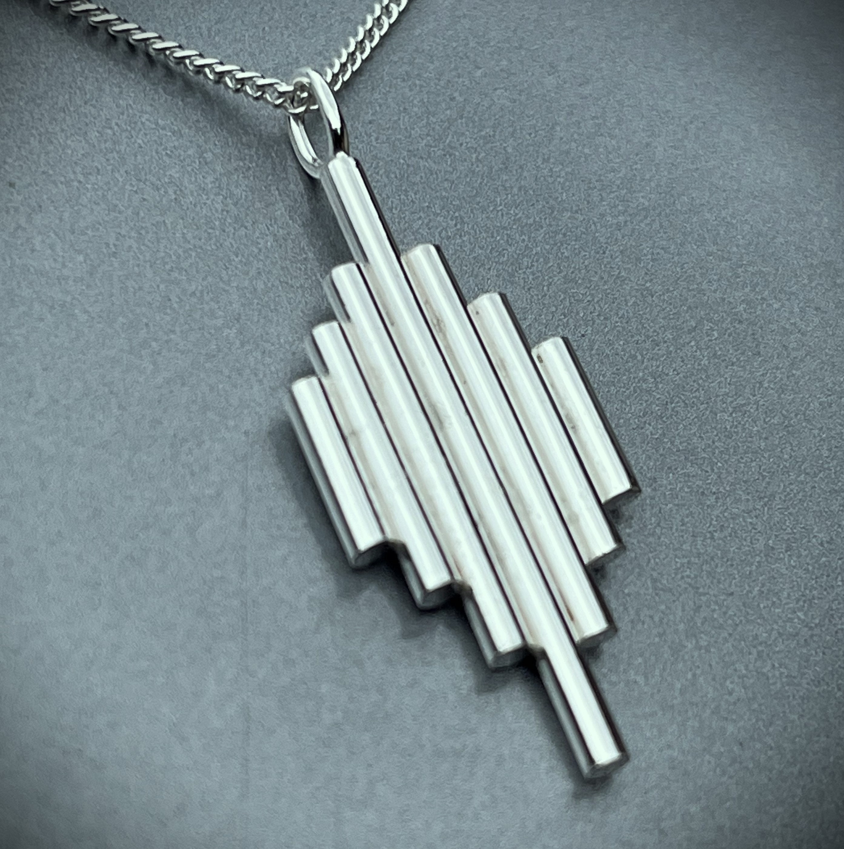 Elevate your style with the Wide Art Deco Tower Pendant, a clean, bold, and unmistakably Deco piece that seamlessly blends architectural lines with a modern edge. This handcrafted pendant is made from 1.8mm sterling silver wire, meticulously manipulated to create crisp geometric lines and a wide, eye-catching profile.
