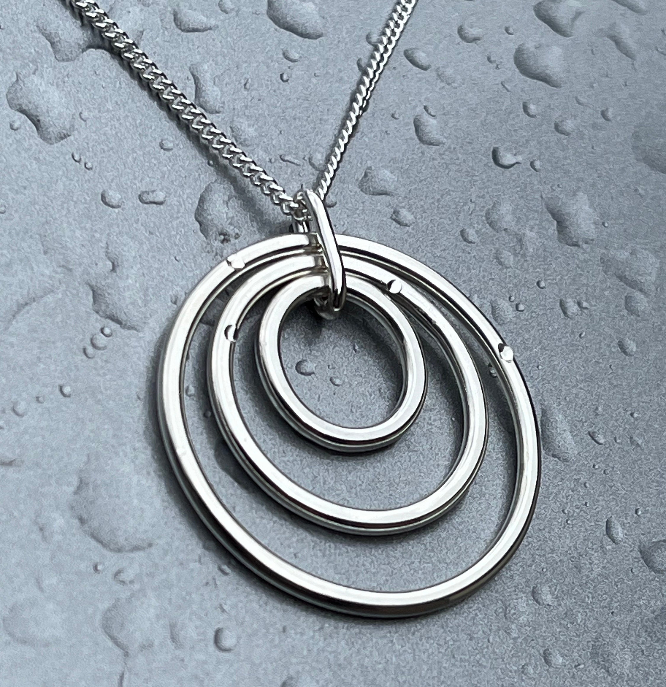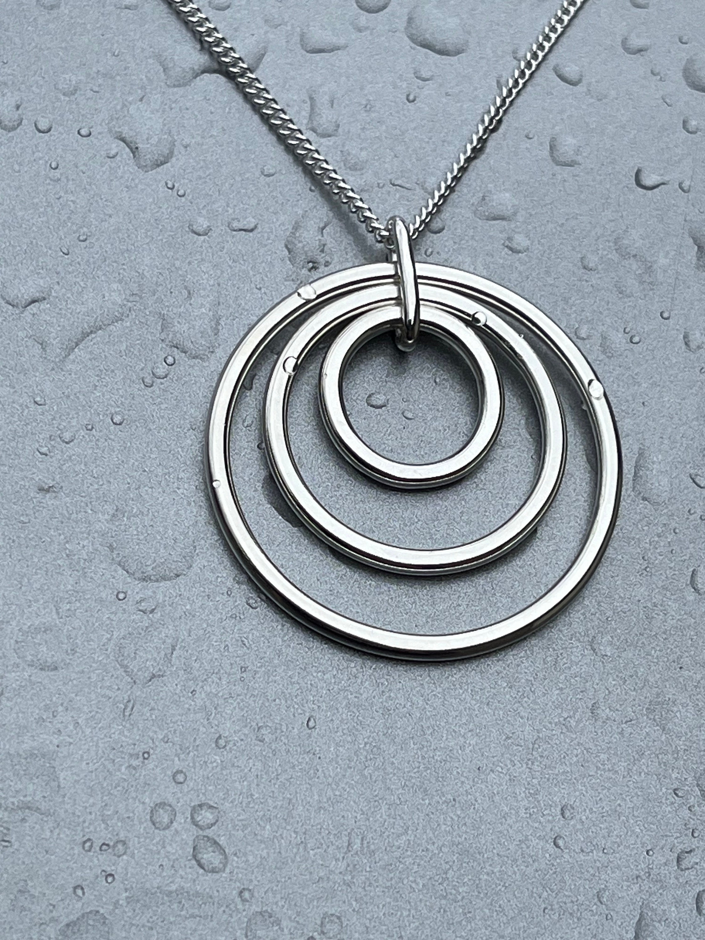 Crafted from three concentric rings made of 1.8 mm sterling silver wire, this pendant is designed to provide a sense of balance and symmetry as they gracefully move together. The largest ring measures 30 mm in diameter and is polished to a high shine, ensuring it catches and reflects light beautifully at every angle. It comes ready to wear on an 18" curb chain with spring claspand is presented in a sleek soft-touch gift box, making it an ideal gift for yourself or a loved one.