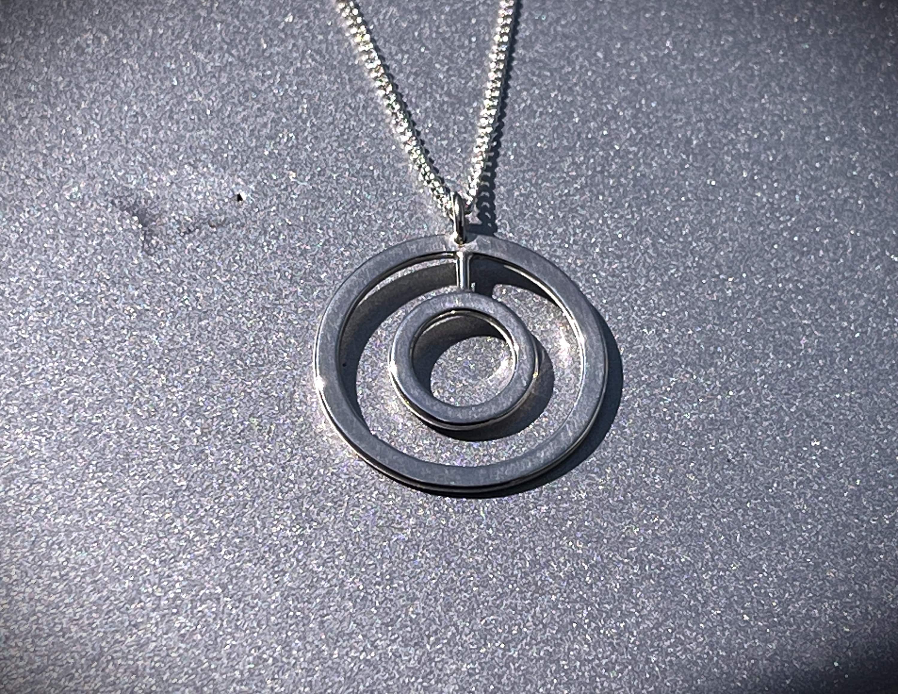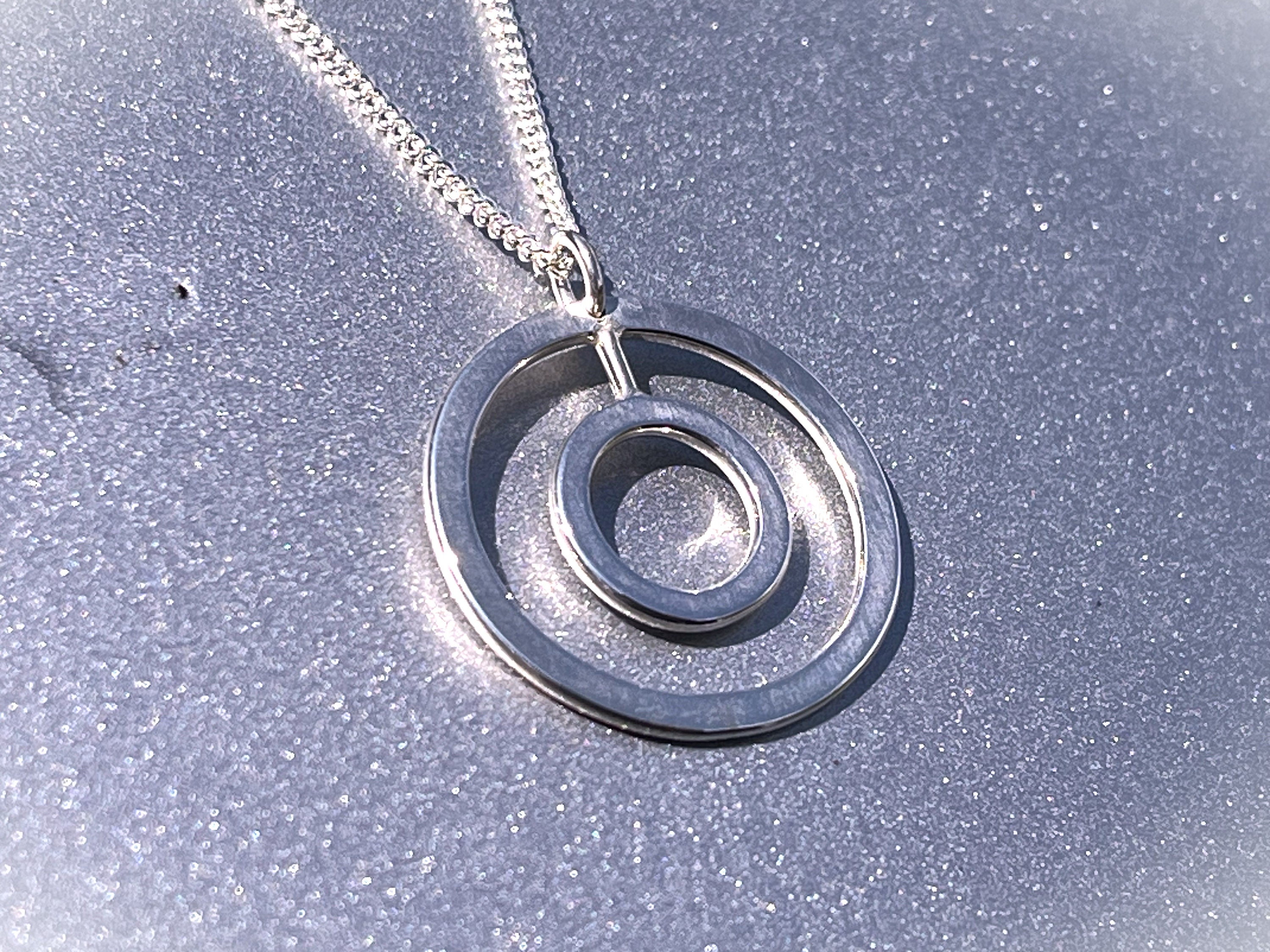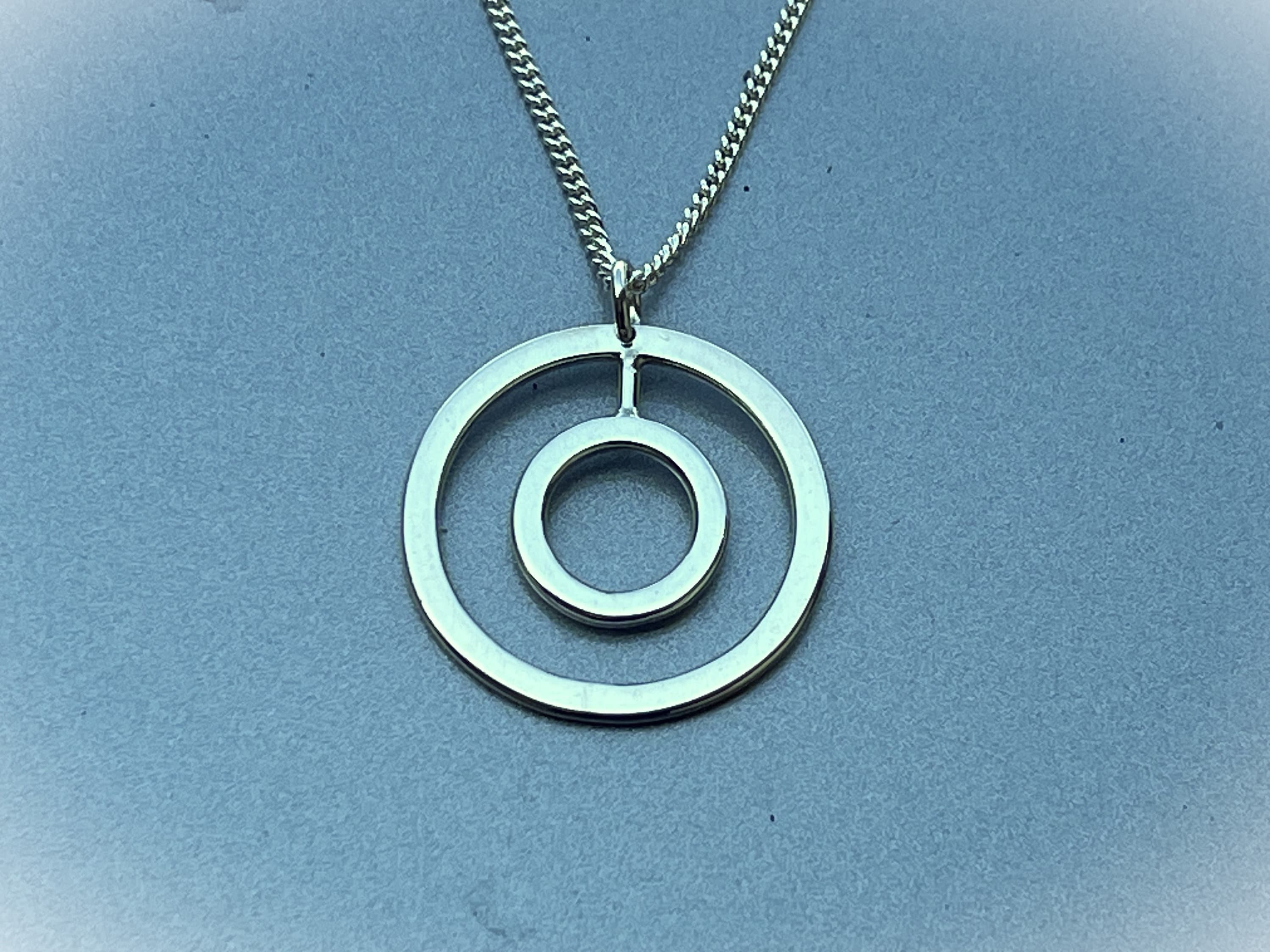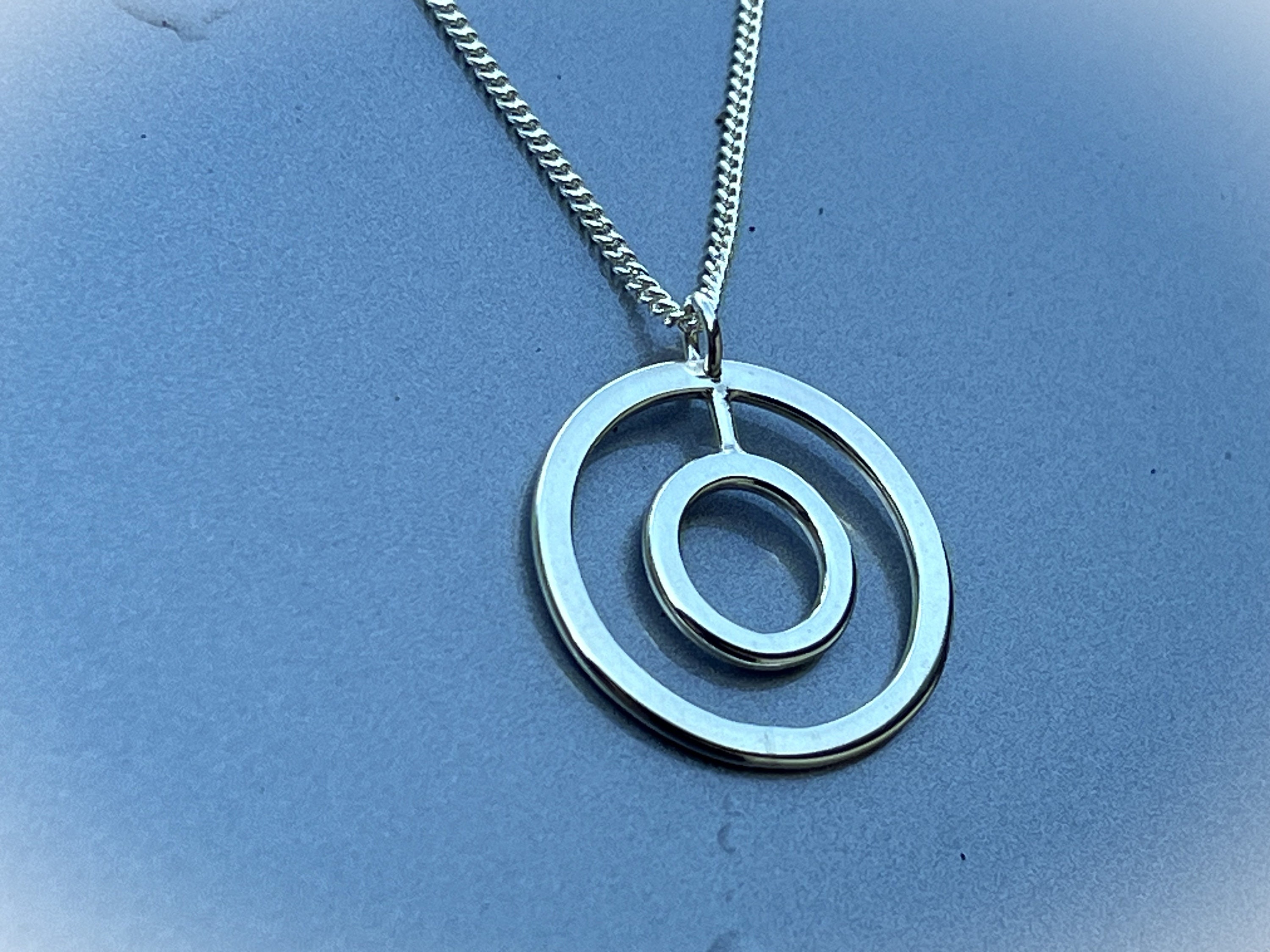 Discover the beauty of simplicity with our Drop Circle Pendant. Crafted from 1.8mm sterling silver wire, this pendant features two interlocking rings that have been flattened for a sleek and modern look. The largest ring measures 25mm across, creating a bold yet subtle statement piece that is perfect for any occasion.