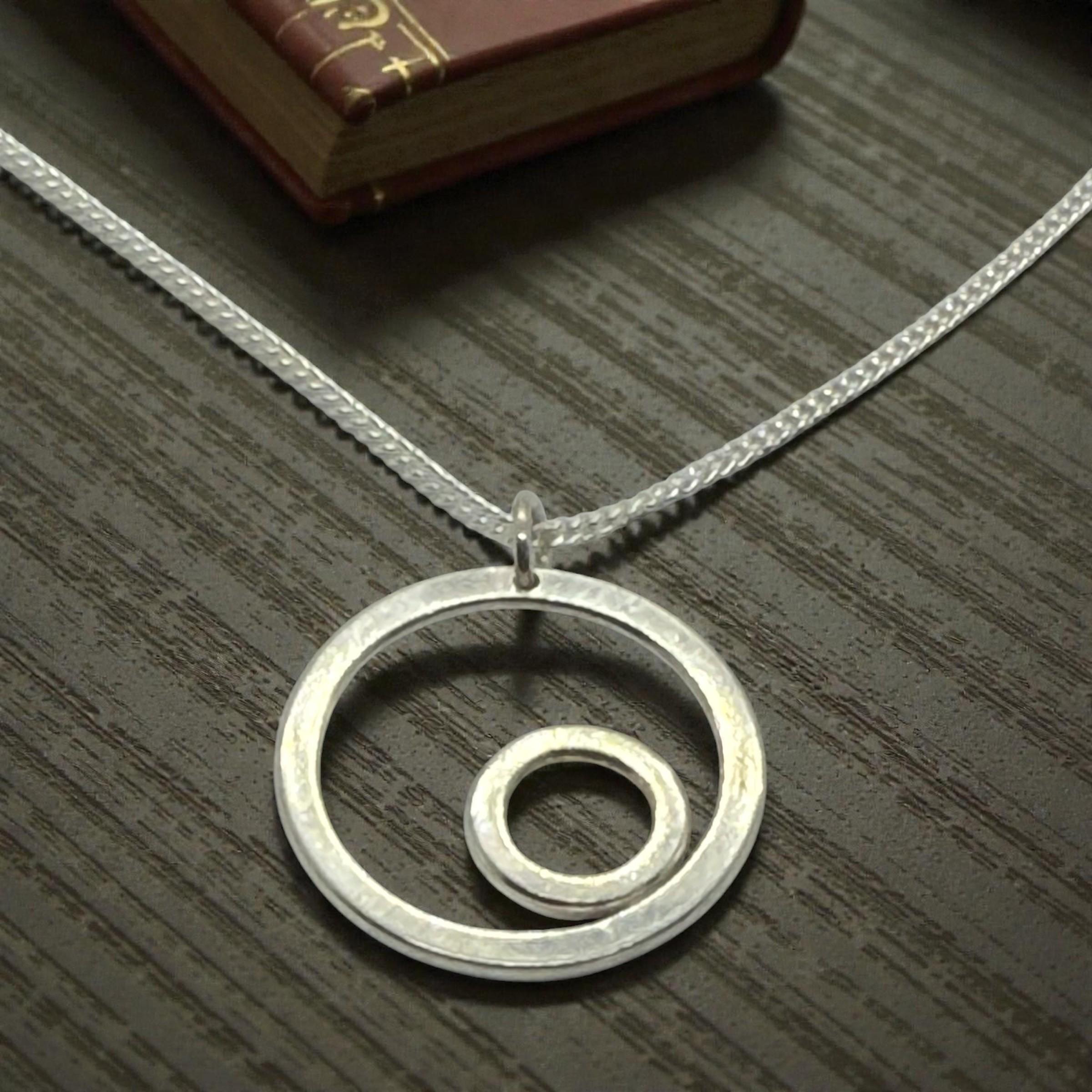 Looking for a unique and elegant piece of jewellery? Look no further! This hand-forged pendant is made from two circles that have been expertly flattened and joined together with a single drop, creating a stunning and eye-catching design.