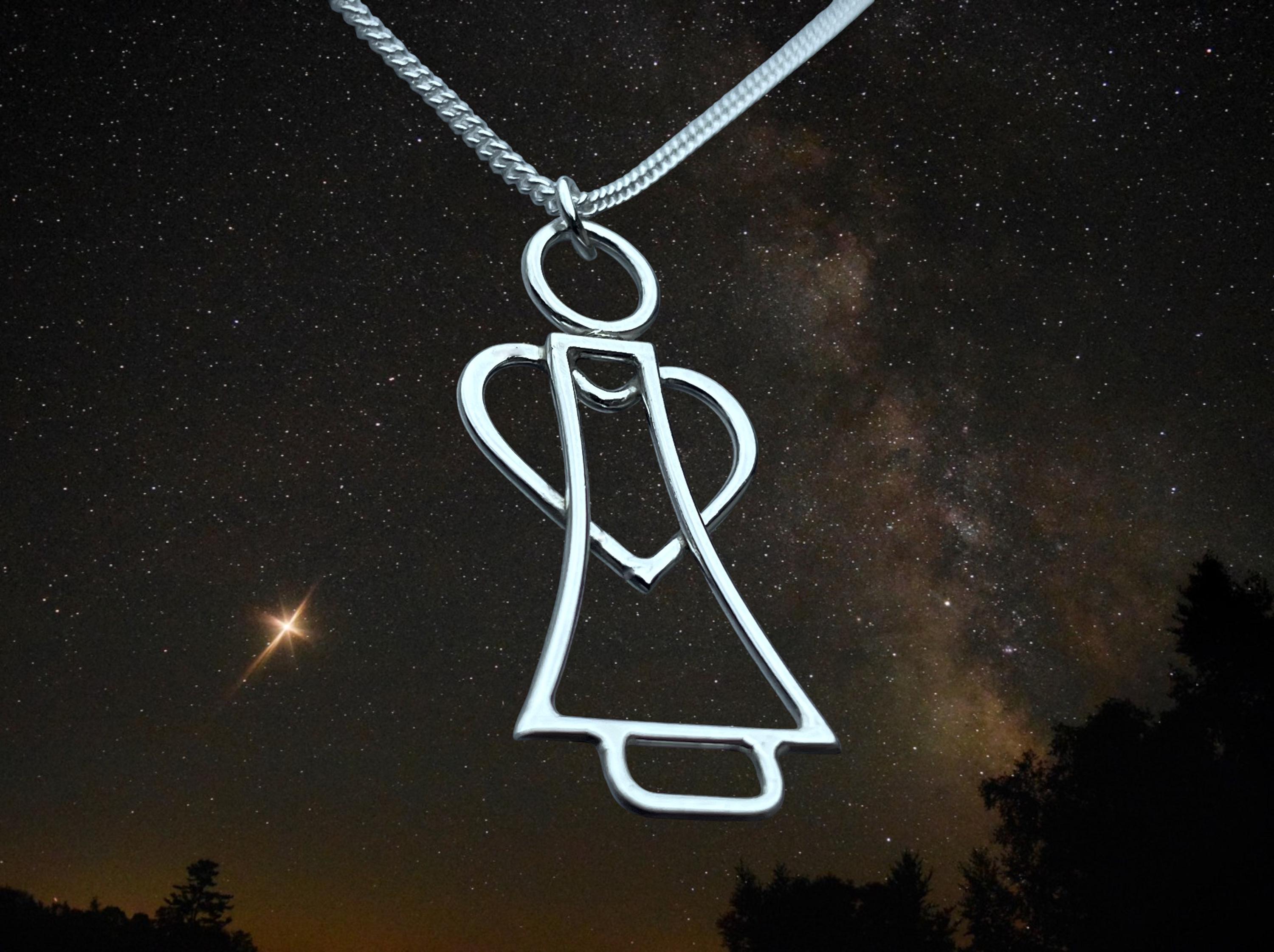 Add a touch of elegance and inspiration to your jewellery collection with our Angel with Heart Wings Pendant. Crafted from high-quality 1.3mm Sterling Silver wire, this pendant is a true testament to artistry and quality, meticulously shaped using traditional handcrafted silversmithing techniques.